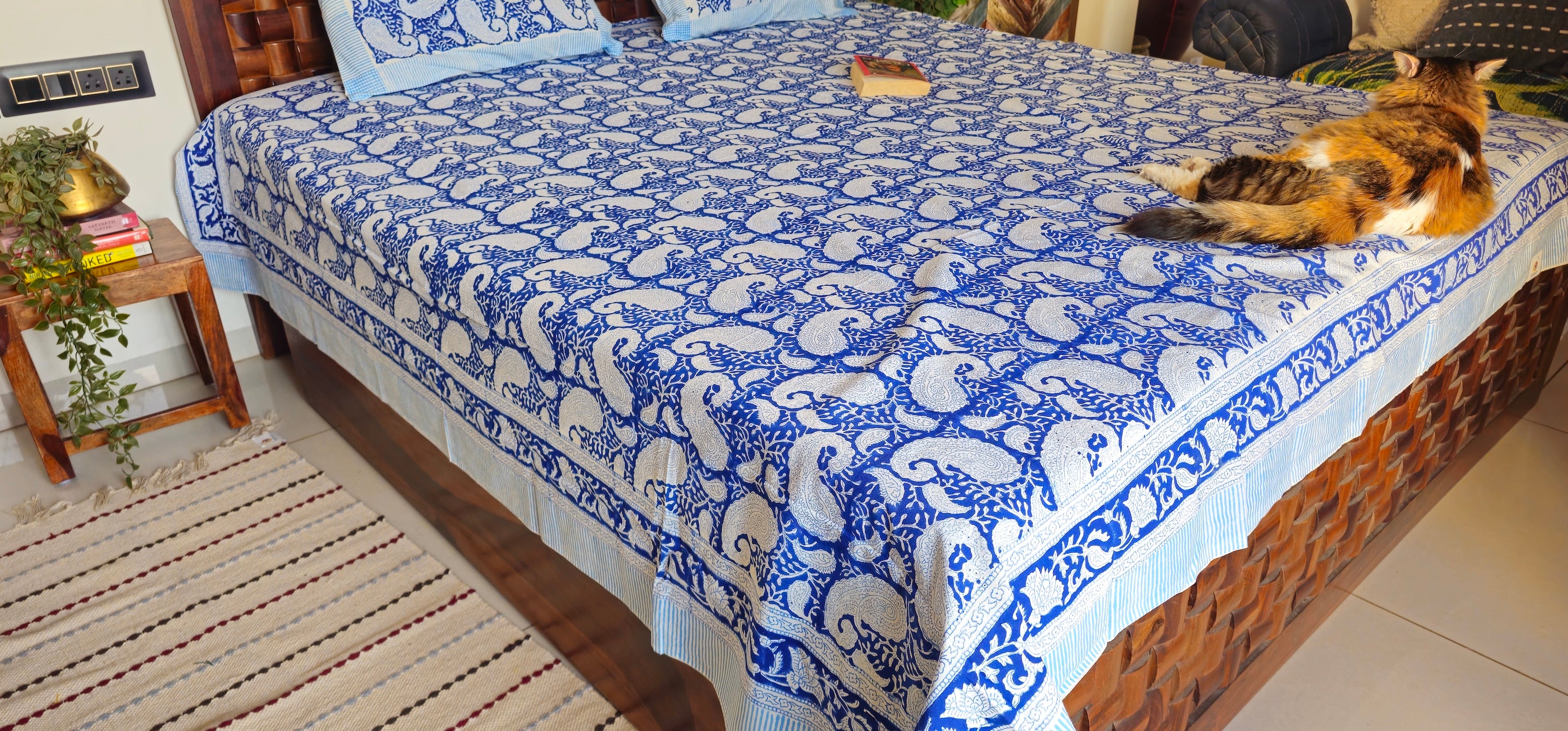 Discover breathable cotton bedsheets, hand block printed bedsheets, reversible kantha bedcovers, quilted bedspreads, and soft pillow covers designed for comfort and longevity. Our bedding collections combine natural fabrics, timeless patterns, and small-batch craftsmanship to create bedroom essentials that feel both refined and practical. From king-size bedsheets and double bed cotton sheets to lightweight dohars for summer and layered bedcovers for winter styling, Varsaca offers versatile options for every season. If you are looking to buy premium bedsheets online in India, handcrafted bed linen, or sustainable cotton bedding, our curated range brings together tradition, quality, and modern design.