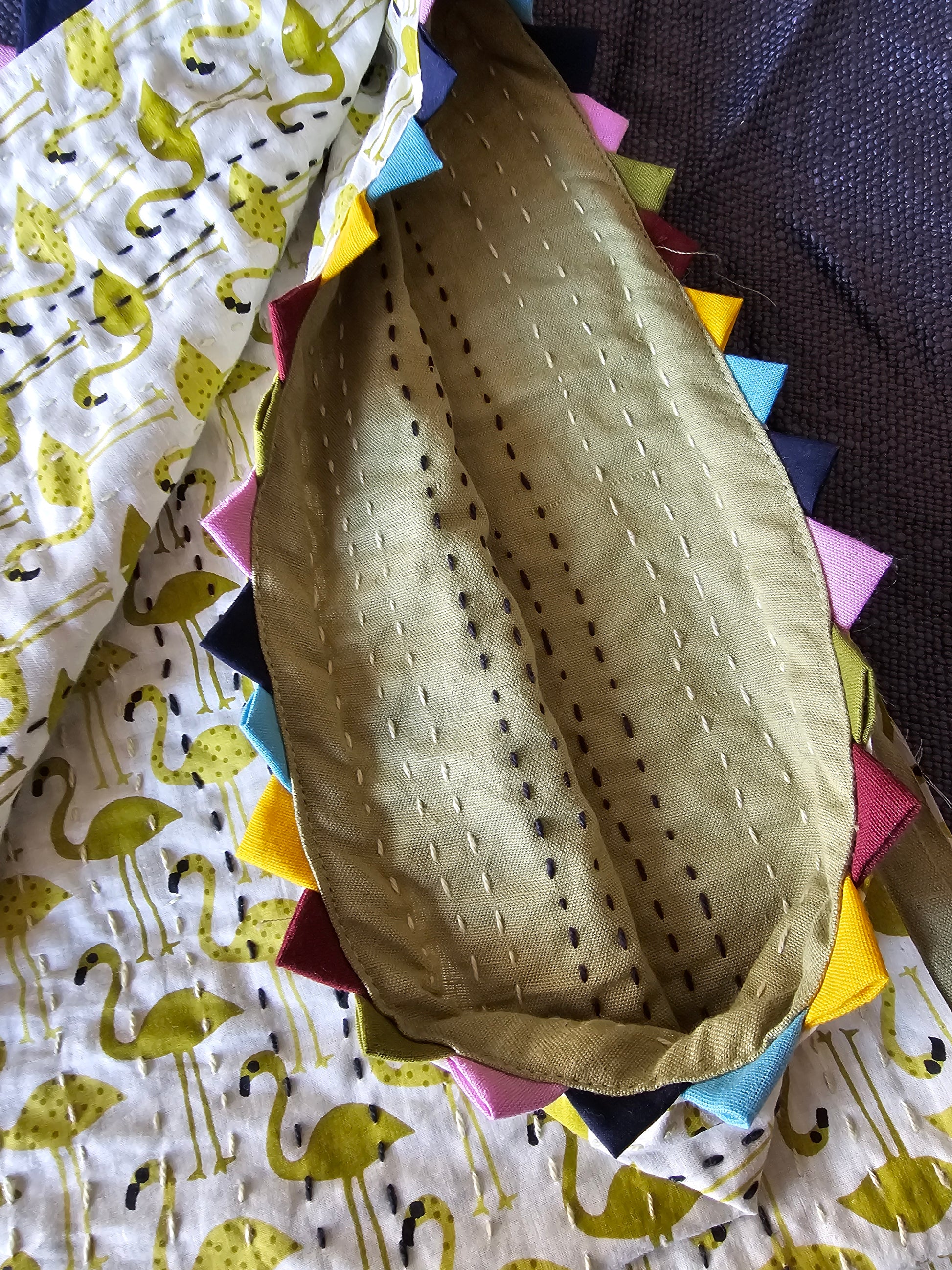Introduce a splash of ocean-themed fun to the nursery with this whimsical Handmade Kantha Baby Quilt. It features a charming flamingo print in shades of green on a soothing light white background, with a coordinating solid green on the reverse. The edge is finished with a lively multicoloured triangle border, adding a playful, unique touch.