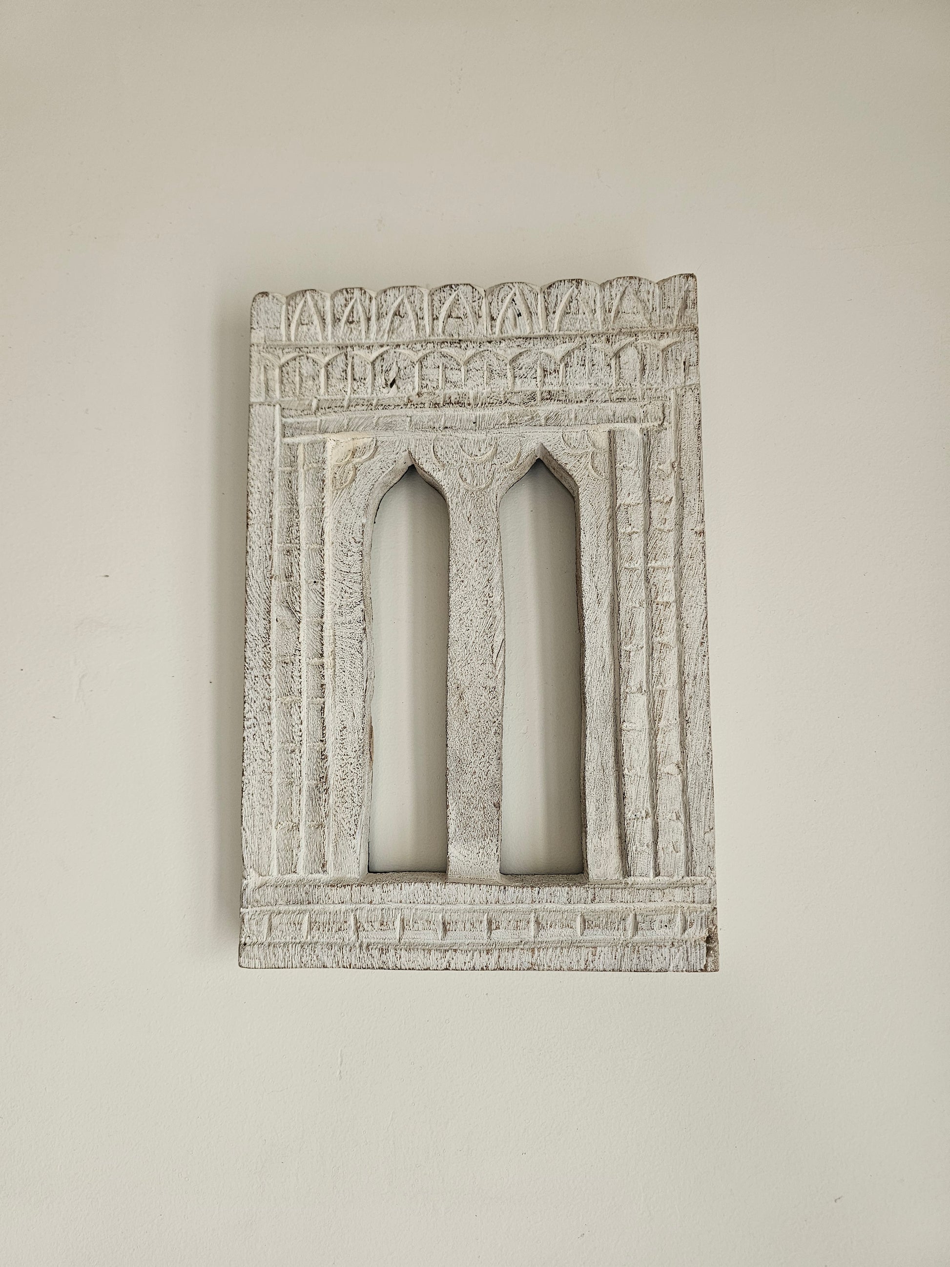 Bring the regal charm of ancient Rajasthani havelis into your modern home with this stunning Hand-Carved Wooden Jharokha. Finished in a distressed vintage white, this decorative wall hanging serves as a window to India’s rich architectural heritage.